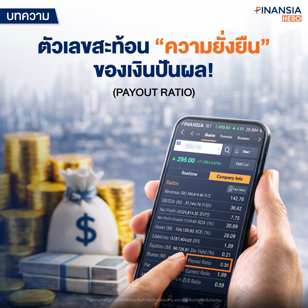 Payout Ratio คืออะไร?10/04/2026HERO Digital MarketingArticle Payout Ratio คืออะไร? ตัวชี้วัดสำคัญของหุ้นปันผลที่บอกว่าบริษัทจ่ายปันผลไหวหรือไม่ พร้อมวิธีวิเคราะห์ความยั่งยืนของเงินปันผลสำหรับนักลงทุน Read More→