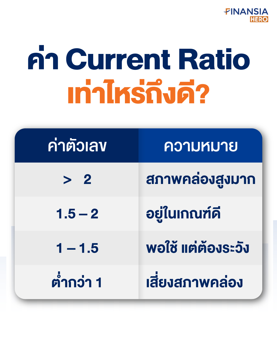 - Current Ratio ต่ำ = อาจมีปัญหาสภาพคล่อง
