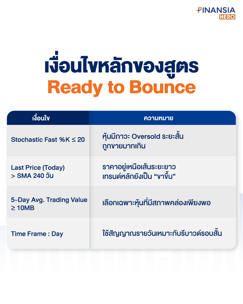 Ready to Bounce เป็นสูตรสแกนหุ้นสำหรับหา “หุ้นที่เทรนด์ขาขึ้น แต่ถูกขายมากเกินไปในระยะสั้น” โดยใช้ตัววัดโมเมนตัมอย่าง Stochastic Fast %K เข้ามาช่วยประเมินว่าแรงขายในรอบสั้นเริ่มมากจนเกินไปหรือไม่