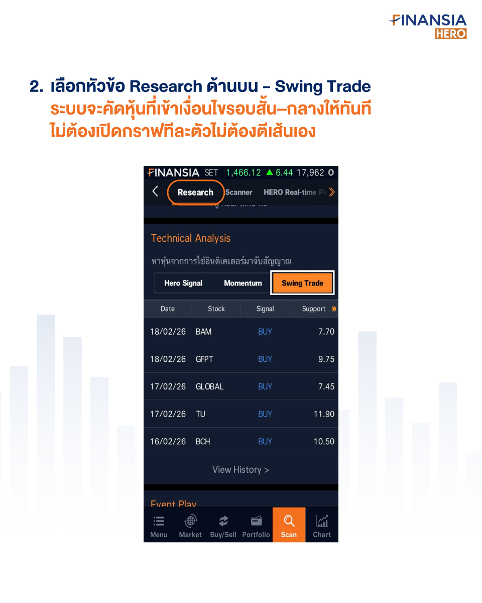 ในโปรแกรม Finansia HERO มีหุ้น Swing Trade ให้ทุกวัน